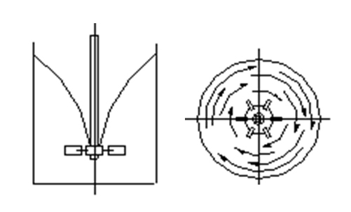 流體流動方向平行于攪拌軸,流體由槳葉推動,使流體向下流動,遇到容器底面再向上翻,形成上下循環(huán)流。